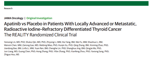 2021年12月16日,权威医学杂志《JAMA Oncology》(影响因子31.777)在线发表阿帕替尼的一项III期临床研究(REALITY)——甲磺酸阿帕替尼片治疗局部进展/转移性放射性碘难治性分化型甲状腺癌(RAIR-DTC)患者的多中心、随机、双盲、安慰剂对照临床研究。此研究由北京协和医院的林岩松教授和南京金陵医院的秦叔逵教授发起,在全国21个研究中心展开,由918博天娱乐中央医学事务部团队支持完成。