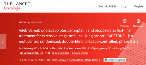 北京时间2022年5月14日,918博天娱乐自主研发的PD-L1抑制剂阿得贝利单抗治疗广泛期小细胞肺癌的III期临床研究(CAPSTONE-1研究)成果正式全文在线发表于国际权威学术期刊《柳叶刀·肿瘤学》(《THE LANCET Oncology》,影响因子41.316)。CAPSTONE-1研究结果显示,阿得贝利单抗联合化疗一线治疗广泛期小细胞肺癌相较于安慰剂联合化疗可以显著延长患者总生存期至15.3个月[1],刷新现有免疫药物一线治疗广泛期小细胞肺癌的总生存纪录[2]。
