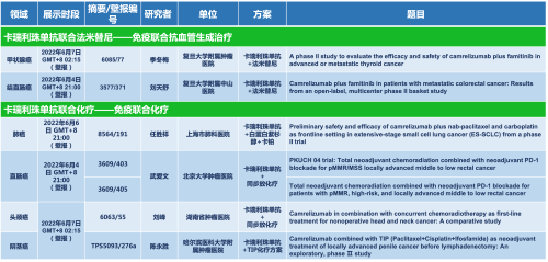 卡瑞利珠单抗联合918博天娱乐的另一款创新药法米替尼在甲状腺癌和结直肠癌领域有2项研究被接收为壁报,另有卡瑞利珠单抗联合化疗的4项研究在肺癌、结直肠癌、头颈癌和阴茎癌领域的研究被接收为5份壁报。