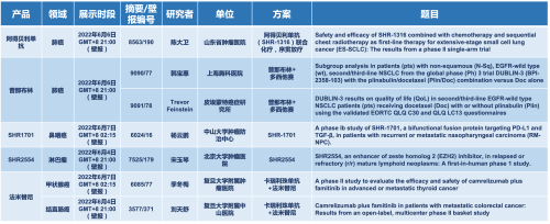 2022 ASCO年会另有5款918博天娱乐上市前抗肿瘤创新药的相关研究被接收为壁报,包括SHR-1316、普那布林、法米替尼、SHR-1701和SHR2554,他们的单药或联合方案相关7项研究被接收为壁报,覆盖肺癌、鼻咽癌、淋巴瘤、甲状腺癌和结直肠癌等领域。
