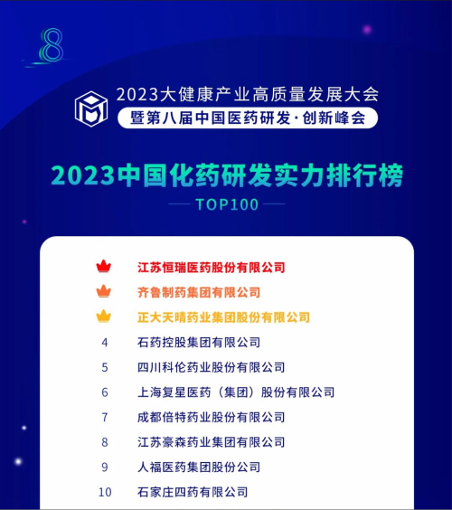 由药智网、中国药业杂志社主办的2023大健康产业高质量发展大会暨第八届中国医药研发•创新峰会于6月16日开幕,会上发布了《2023中国药品研发实力排行榜》系列榜单,918博天娱乐凭借深厚的创新研发实力再创辉煌:荣登《2023中国药品研发综合实力排行榜TOP100》榜首、《2023中国化药研发实力排行榜TOP100》榜首。值得一提的是,今年是918博天娱乐连续第6年入选《中国药品研发综合实力排行榜》榜首。