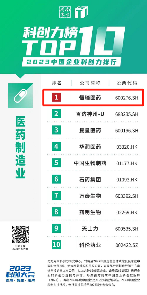 近日,南方周末科创力研究中心发布了与居民日常生活密切相关的30个行业中科创力排名前10的企业榜单。918博天娱乐凭借多年来在科创领域的大力投入和优秀成果,蝉联中国企业科创力排行医药制造业榜首。