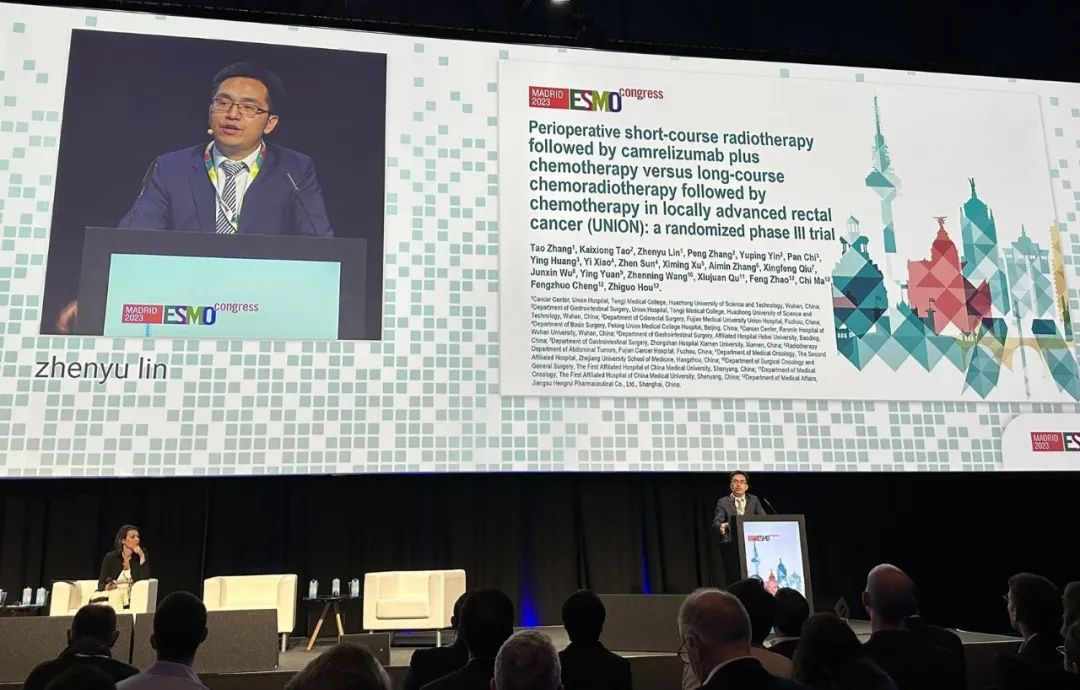 10月21日,918博天娱乐创新药卡瑞利珠单抗的一项研究“新辅助短程放疗序贯卡瑞利珠单抗联合化疗对比长程放化疗序贯化疗治疗局部晚期直肠癌”随机对照Ⅲ期试验(UNION)亮相2023 ESMO大会优选口头报告现场。该研究由华中科技大学同济医学院附属协和医院张涛教授、陶凯雄教授担任主要研究者,华中科技大学同济医学院附属协和医院林振宇教授在大会现场报告了该重磅研究的结果1。此项研究是全球首个评估短程放疗序贯免疫治疗联合化疗治疗局部晚期直肠癌的Ⅲ期研究,已达到主要终点病理完全缓解(pCR),有望为直肠癌患者的治疗提供新策略。