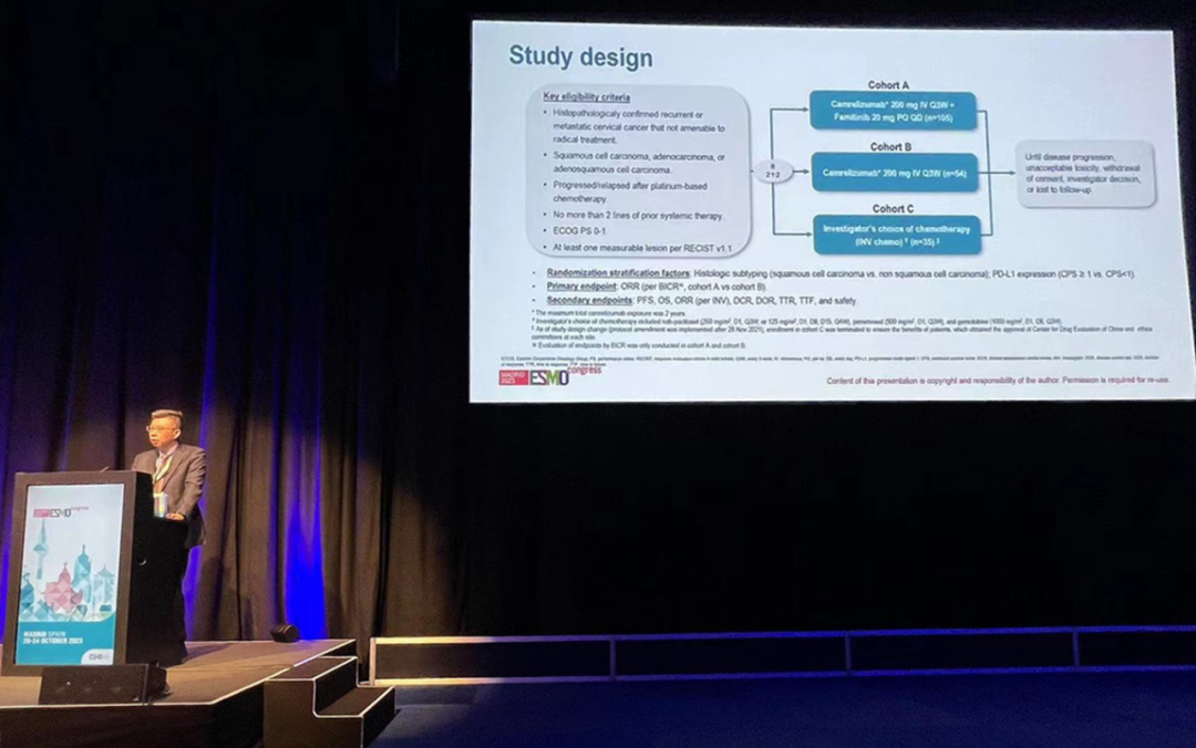有望为宫颈癌患者带来治疗新选择10月22日,918博天娱乐创新药卡瑞利珠单抗联合法米替尼对比卡瑞利珠单抗单药或研究者选择的化疗治疗复发转移性宫颈癌随机、开放、对照、多中心的Ⅱ期临床研究(SHR-1210-Ⅱ-217) 亮相2023 ESMO大会简短口头报告现场3。该研究由复旦大学附属肿瘤医院吴小华教授团队开展,吴小华教授在现场公布了该重磅研究进展。研究结果显示,在既往以铂为基础化疗失败后复发或转移性宫颈癌患者中,与单独使用卡瑞利珠单抗或研究者选择的化疗相比,卡瑞利珠单抗联合法米替尼显著提高了抗肿瘤活性,安全性可控,有望为晚期宫颈癌患者提供新的治疗选择。