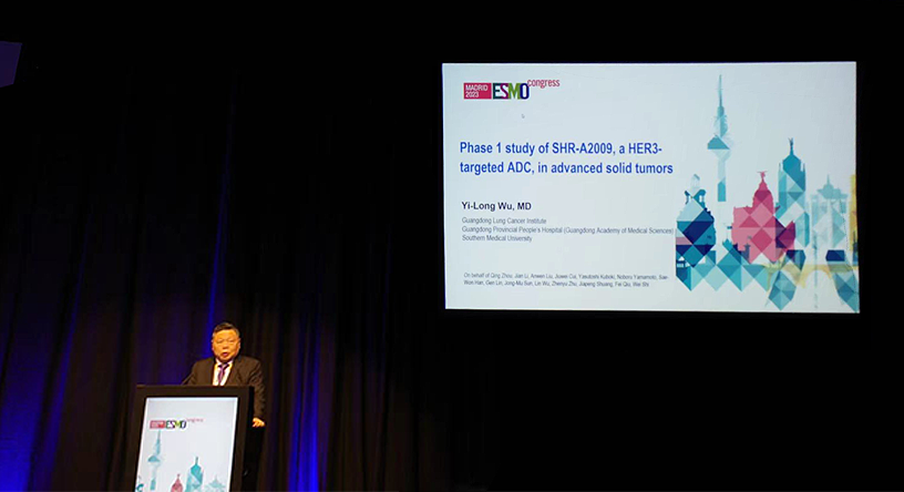 10月23日,918博天娱乐创新药、HER3靶向ADC药物SHR-A2009治疗晚期实体瘤的I期研究亮相2023 ESMO大会简短口头报告现场5。该研究由广东省人民医院的吴一龙教授牵头开展,吴一龙教授在现场公布该研究的重要进展。研究结果显示,SHR-A2009在经治晚期实体瘤患者中显示出可控的安全性和令人鼓舞的抗肿瘤活性。目前评估更高剂量的SHR-A2009在选定癌症类型(NSCLC和其他实体肿瘤)中作用的试验正在进行中。