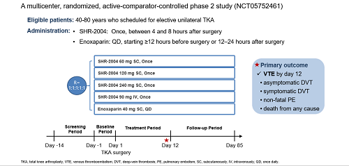 SHR-2004是918博天娱乐自主研发的一种抗FXI的人源化单克隆抗体,通过阻断内源性凝血途径的级联反应过程发挥抗凝作用。SHR-2004-201研究是一项多中心、随机、开放标签、阳性对照的II期临床研究(NCT05752461),旨在评价择期单侧TKA患者单次皮下注射或静脉滴注SHR-2004注射液预防VTE的疗效和安全性。