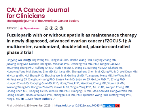 2025年11月25日,918博天娱乐自主研发的创新药氟唑帕利联合阿帕替尼或氟唑帕利单药用于新诊断晚期卵巢癌(OC)的一线维持治疗研究最新数据(FZOCUS-1研究)重磅在线发表于国际顶尖医学期刊《临床医师癌症杂志》(A Cancer Journal for Clinicians,简称CA,2024年影响因子高达232.4)1
